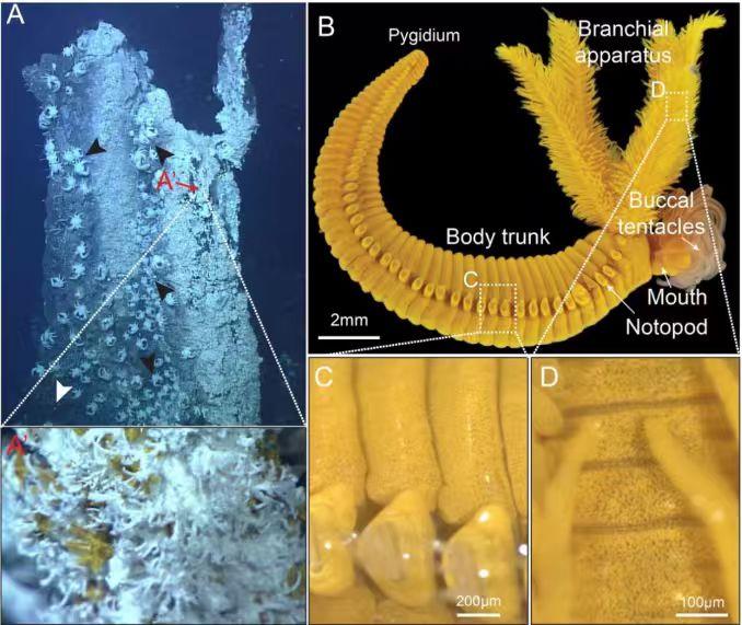 圖1?A:賀氏擬阿爾文蟲生活的深海熱液煙囪,其中A’顯示熱液噴口附近的賀氏擬阿爾文蟲群落;B:賀氏擬阿爾文蟲個體;C和D:賀氏擬阿爾文蟲軀干及頭冠皮下表的亮黃色顆粒。