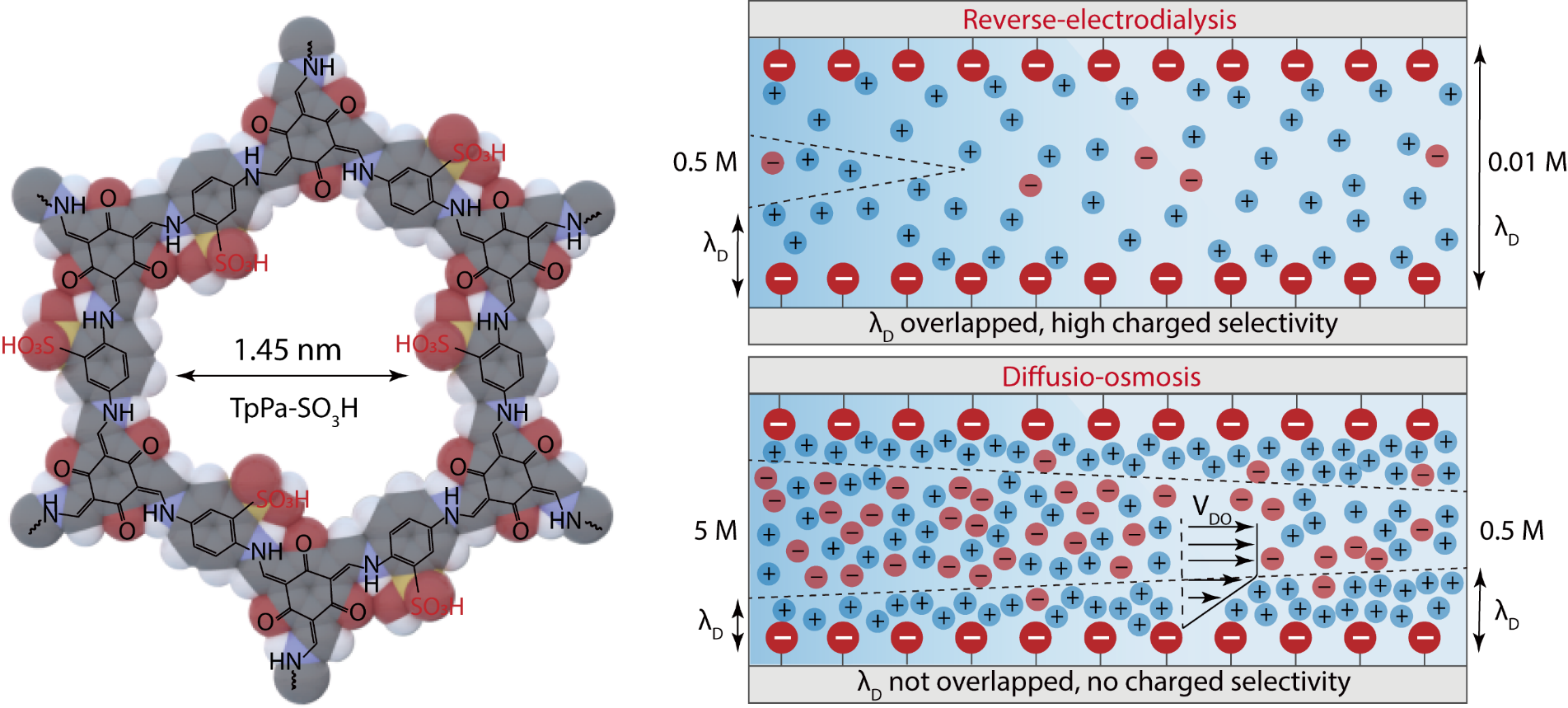 此前,利用單孔氮化硼納米管、石墨納米通道的研究已表明該機制有望實現(xiàn)超高功率密度的鹽差能轉(zhuǎn)換,但在膜尺度上仍缺乏相關(guān)研究。研究團隊針對難以找到合適的膜材料匹配該機制開展研究,發(fā)現(xiàn)利用磺酸共價有機框架(COF)膜致密分布的磺酸基團、垂直排列的孔道結(jié)構(gòu),可以實現(xiàn)基于擴散-滲透機制的可規(guī)?;}差發(fā)電。