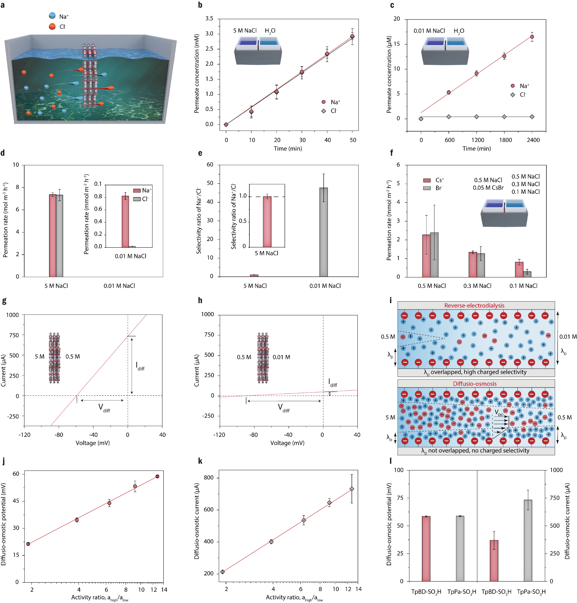 針對上述問題,青島能源所高軍研究員與山東大學劉鵬教授合作,提出了一種利用擴散—滲透(diffusio-osmosis)機制來收集鹽差能的新方法,不同于選擇性機制的RED技術(shù),該機制產(chǎn)生的電流源于雙電層內(nèi)界面滲透壓梯度驅(qū)動的擴散—滲透流攜帶的凈電荷,不依賴膜材料的離子選擇性。