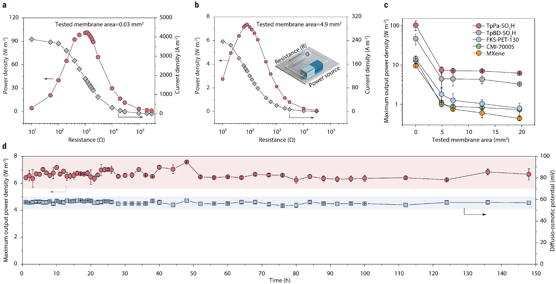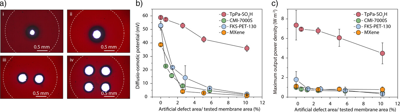 在5 M/0.5 M NaCl濃度梯度下,由于COF通道內(nèi)的德拜長度(λD)不重合,因此該膜不具備電荷選擇性,Na+和Cl-的滲透測試進一步驗證了這一結(jié)論。此外,擴散—滲透電流與活度比的對數(shù)呈線性關(guān)系,表明擴散—滲透機制主導了鹽差能轉(zhuǎn)換過程。此過程中,COF致密分布的磺酸基團提供了高電荷密度,增強了電雙層內(nèi)界面滲透壓梯度從而能有效產(chǎn)生擴散—滲透流,結(jié)合其垂直排列的一維孔道,能高效驅(qū)動離子輸運。避免了傳統(tǒng)RED對選擇性的依賴,克服了“通量—選擇性”博弈和濃差極化等問題。在0.03 mm2測試面積下,實現(xiàn)了101.2 W m-2的最大功率密度,顯著高于多數(shù)已報道材料。當膜面積放大兩個數(shù)量級(~20 mm2),功率密度仍能維持在~7 W m-2。這一新機制的優(yōu)勢在于不依賴膜材料的離子選擇性,使得體系表現(xiàn)出前所未有的抗缺陷能力,即便在膜上引入超過測試面積10%的針孔缺陷,仍能維持穩(wěn)定的輸出電壓與輸出功率,而傳統(tǒng)RED膜在類似條件下幾乎完全失效。這一發(fā)現(xiàn)顯著提高了膜材料的制備容錯度,有望降低膜材料的制造成本并提高其工程化應(yīng)用的可行性。
