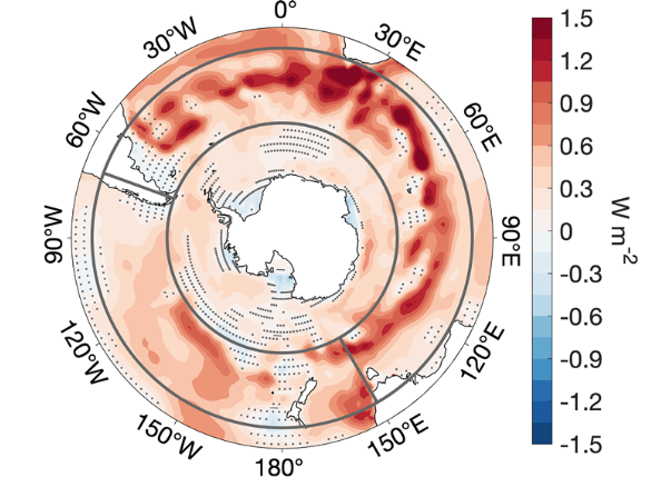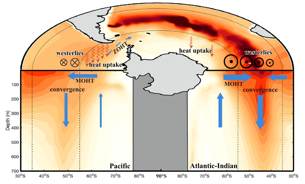 自20世紀中期以來,地球系統(tǒng)因溫室氣體累積而吸收的多余熱量超過90%被儲存在海洋中。其中,南大洋(Southern Ocean)對全球海洋熱儲的貢獻達60%,是全球氣候系統(tǒng)變化的“熱量閥門”。它的持續(xù)變暖不僅影響南極冰架融化、全球海平面上升,還深刻改變深層水體形成、海洋碳吸收能力與海洋生態(tài)系統(tǒng)。過去的研究普遍采用緯向平均的方法,描繪出南大洋以45°S為中心的經向(南北向)升溫結構:靠近南極的高緯海區(qū)吸熱后,熱量被風驅動的經向流輸送至中緯度海區(qū)。但南大洋增暖的緯向結構仍不清楚。
